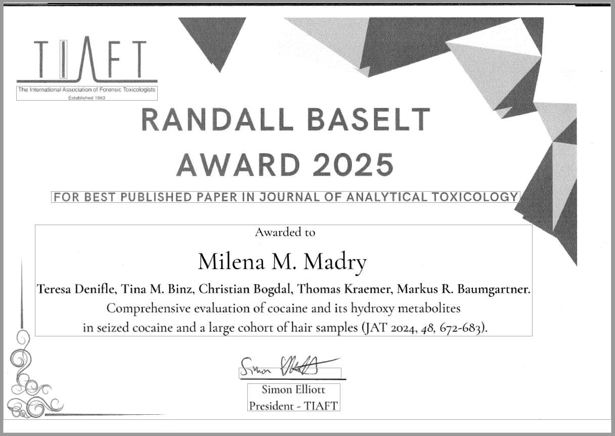 Die forensisch-toxikologische Fachgesellschaft «The International Association of Forensic Toxicologists» (TIAFT) hat an ihrer Jahrestagung in Auckland, Neuseeland, Milena M. Madry den Randall Baselt Award 2025 für ihre wissenschaftliche Publikation im Journal of Analytical Toxicology verliehen. Die Publikation mit dem Titel „Comprehensive evaluation of cocaine and its hydroxy metabolites in seized cocaine and a large cohort of hair samples“ liefert wertvolle Ergebnisse für die Interpretation Cocain positiver-Haaranalysebefunden.